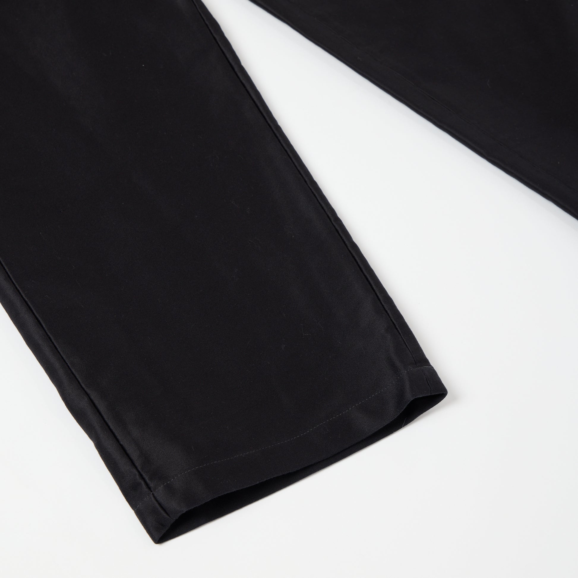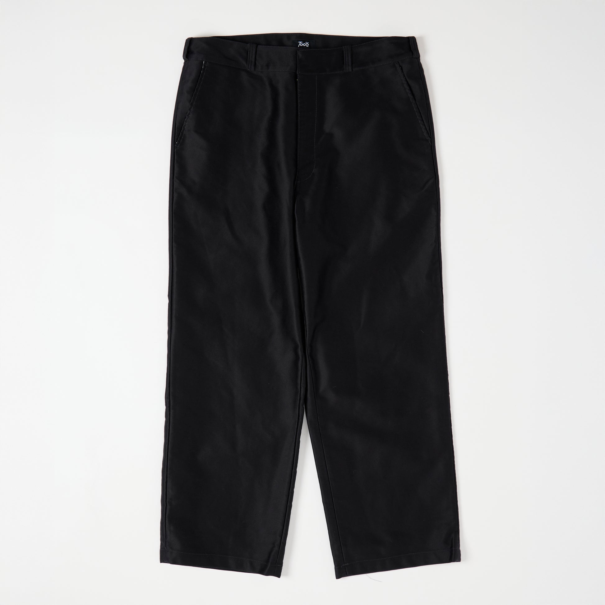 腰回りはフィットしつつ、ワタリから裾にボリューム感があるワークパンツ。生地に厚みあるモールスキン素材を使用し、冬用パンツとしておススメです。ワークパンツでありながら、光沢感とブラックカラーで上品な仕上がり。